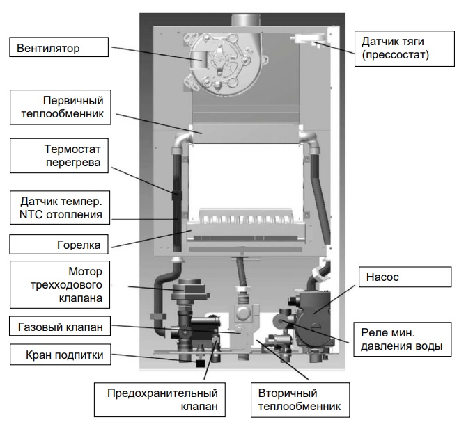 - Защитный термостат от перегрева теплоносителя в первичном теплообменнике