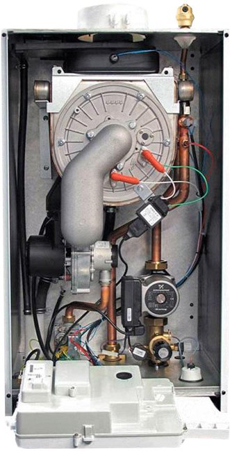 Закрытая камера сгорания (по-другому такие котлы называют турбированными) подразумевает наличие в данном котле вентилятора, который принудительно осуществляет забор воздуха и удаление продуктов сгорания на улицу или коллективный дымоход. Для таких котлов обычно используют коаксиальные дымоходы — "труба в трубе"