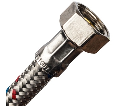 Гибкие подводки STOUT предназначены для присоединения санитарно-технического и бытового оборудования к транспортирующей воду трубопроводной сети. Гибкая подводка представляет собой шланг из нетоксичной резины в оплетке из нержавеющей стали. По концам подводки напрессованы ниппели с наружной резьбой или с накидной гайкой, укомплектованной прокладкой.
