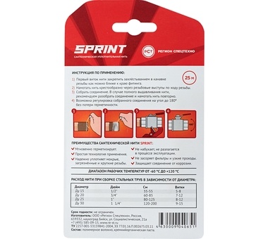 Сантехническая уплотнительная нить «SPRINT», 25 м, бокс, блистер (TM-040065)