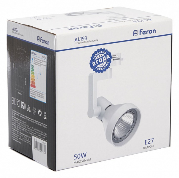 Светильники трековые на шинопровод E27, однофазный (ИВО) FERON AL193, 50W, 230V, цвет белый, корпус сталь, вращение →350°/↓90°, 114*114*250 мм