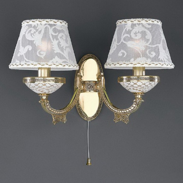 Бра A 7132/2 из коллекции 7132 от итальянской фабрики Reccagni Angelo украсит гостиную, кабинет, спальню в стиле флористика. Материал изделия – латунь, стекло, цвет глянцевый белый с рисунком, золото французское. Бра имеет 2 плафона из текстиля с цоколем 2xE14 общей мощностью 120W. Технические особенности модели: способ крепления светильника на стене – на монтажной пластине, светильник предназначен для использования со скрытой проводкой. Габариты: ширина – 38 см, высота – 25 см, выступ – 24 см.