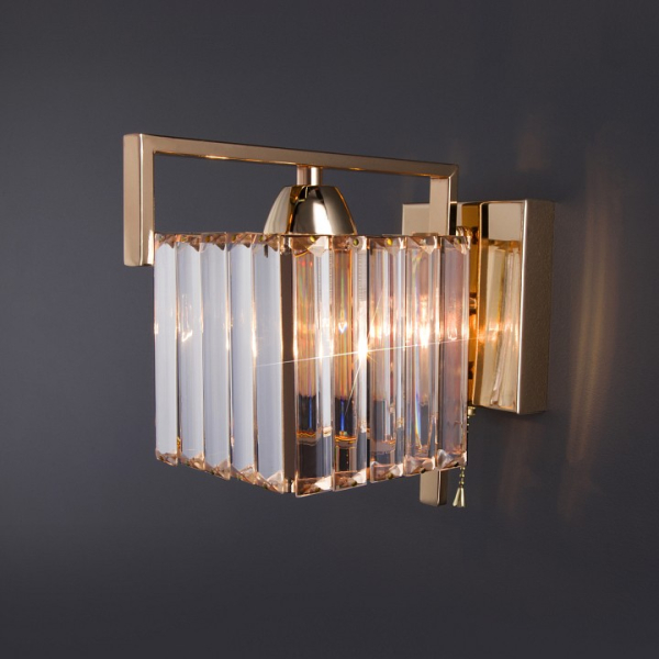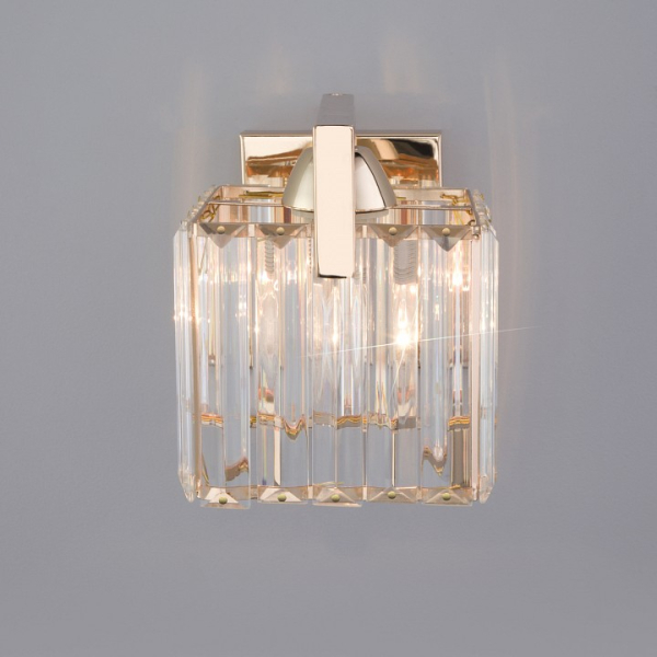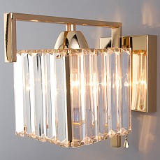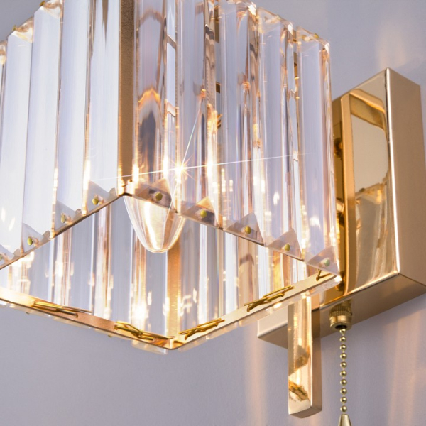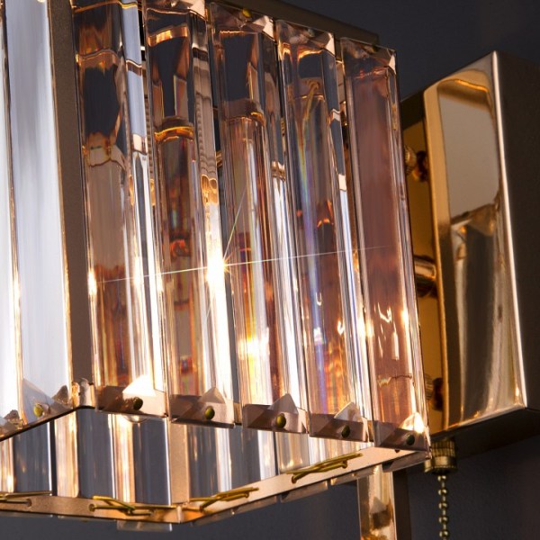 Форма плафона призма квадратная, цвет плафона прозрачный, цвет арматуры золото. Лампы в комплекте: отсутствуют. Светильник имеет слабую защиту от влаги и пыли — IP20 и предназначен для использования в домашних интерьерах с умеренной влажностью.