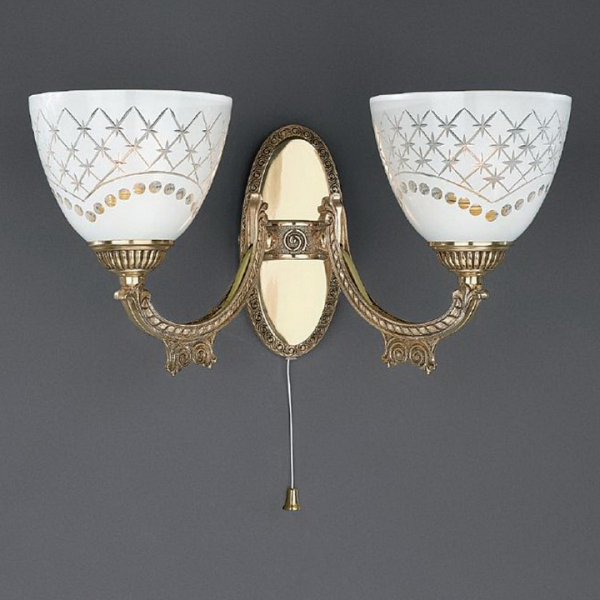 Бра A 7152/2 из коллекции 7152 от итальянской фабрики Reccagni Angelo украсит гостиную, кабинет, спальню в стиле флористика. Материал изделия – латунь, цвет глянцевое золото французское. Бра имеет 2 плафона из стекла с цоколем 2xE27 общей мощностью 120W. Технические особенности модели: способ крепления светильника на стене – на монтажной пластине, светильник предназначен для использования со скрытой проводкой. Габариты: ширина – 36 см, высота – 18 см, выступ – 24 см.