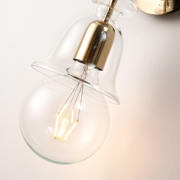 Форма плафона колокол расходящийся, цвет плафона неокрашенный, цвет арматуры золото. Лампы в комплекте: отсутствуют. Светильник имеет слабую защиту от влаги и пыли — IP20 и предназначен для использования в домашних интерьерах с умеренной влажностью.