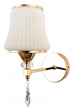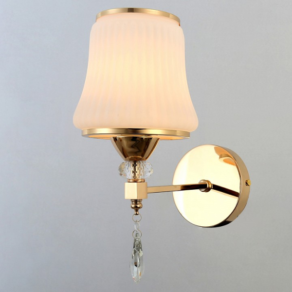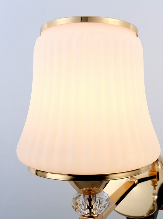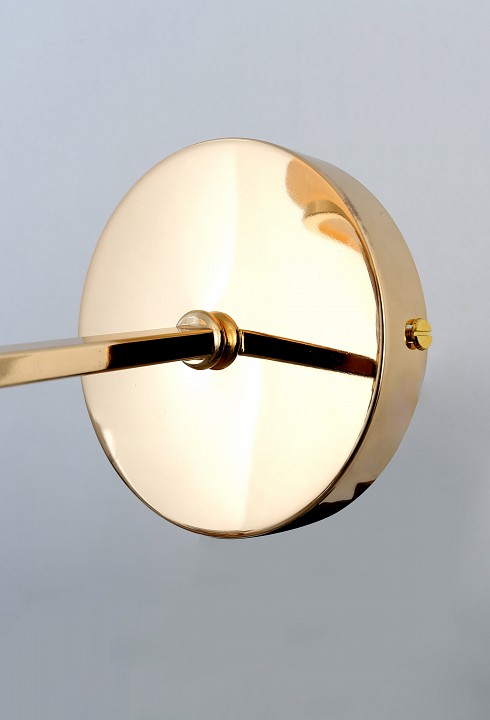 Форма плафона конус круглый усеченный, цвет плафона белый, неокрашенный, цвет арматуры золото. Лампы в комплекте: отсутствуют. Светильник имеет слабую защиту от влаги и пыли — IP20 и предназначен для использования в домашних интерьерах с умеренной влажностью.