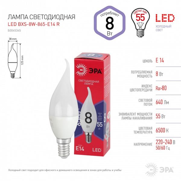 Лампа светодиодная Эра ЭКО E14 8Вт 6500K Б0045345
