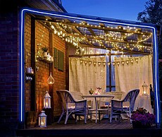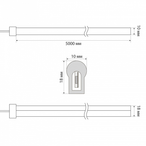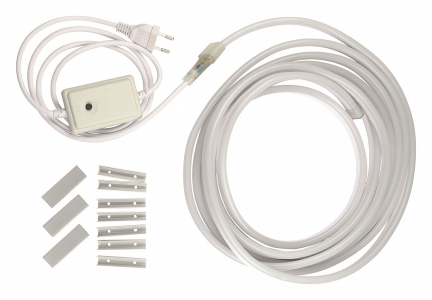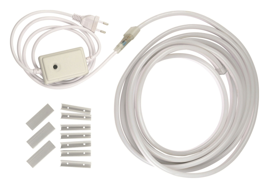 Гибкий влагостойкий светодиодный неон 5 м в блистере; герметичная силиконовая оболочка, предназначена для использования на улице, клейкое основание с защитной пленкой, цвет основания: белый, тип светодиодов: NEON, кратность резки: 1 метр при выборе блока питания следует учитывать общую мощность ленты или нескольких лент, соединенных вместе, с добавлением 10-20 % запаса по мощности