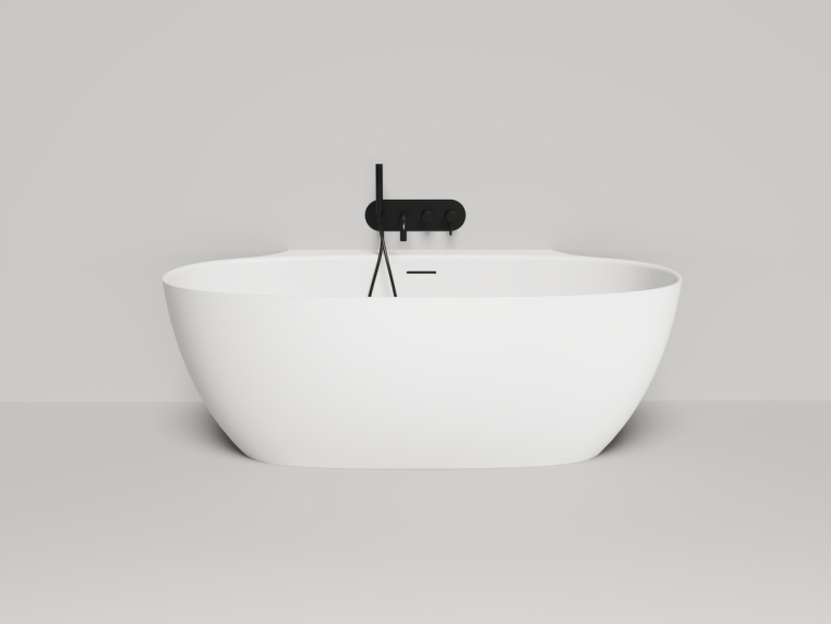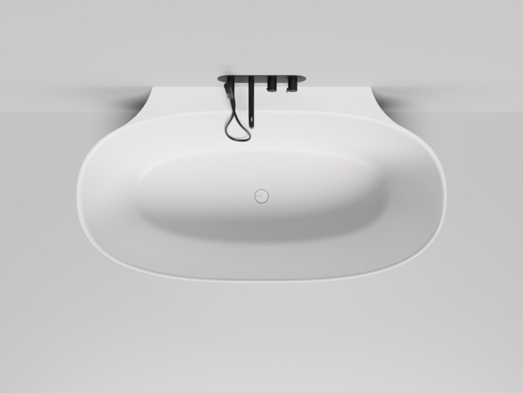 Эта модель соединяет в себе классическую овальную форму изголовий и спрятанный за ними пристенный борт. Благодаря такой конструкции создаётся впечатление отдельностоящей ванны, но сохраняется практичность плотного примыкания к стене и дополнительной поверхности для хранения косметических средств и аксессуаров. При желании здесь также можно разместить и смеситель. Более тонкая, детальная проработка формы чаши позволила уйти от классического понимания пристенной ванны с массивной боковой проекцией: блок, соприкасающийся со стеной, будто утоплен вдоль задней поверхности. Такова новая эстетика облегчённого дизайнерского решения Salini.
