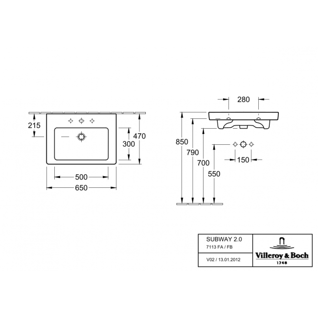 Villeroy & Boch Subway 2.0 Pаковина, 650 x 470 x 180 mm, Альпийский белый, с переливом, нешлифованный