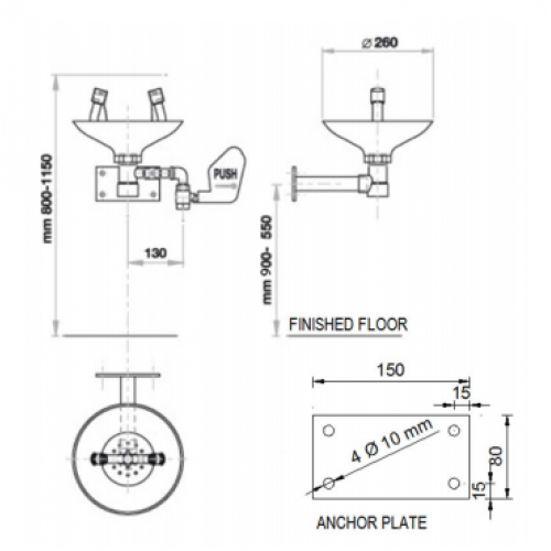 Раковина настенная для промывки глаз Nofer SC300. Предназначена для заводов, фабрик, лабораторий, где есть риск нанесения вреда здоровья рабочему персоналу от огня, кислот, и прочих химических или радиоактивных реагентов. Приводится в действие с помощью бокового рычага.
