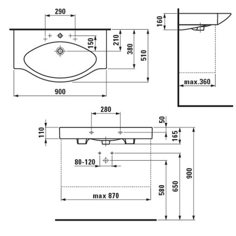 Раковина Laufen Palace 90х51х11см (чаша), санфарфор, 1 отверстие для смесителя, подвесная, без полотенцедержателя, может быть установлена на тумбу.