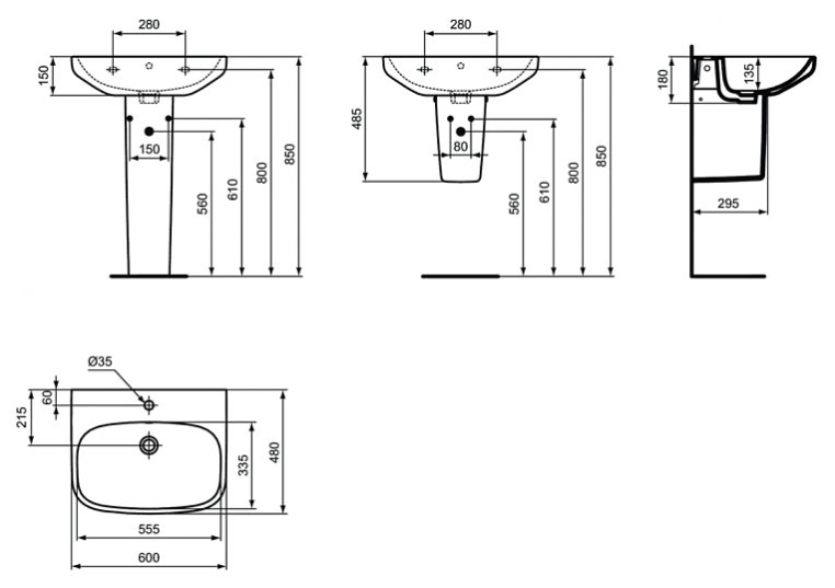 IS i.life A Умывальник 60 см, 1 отверстие под смеситель, с отверстием перелива, без крепежа, для монтажа с колонной T471201 или полуколонной T471301 или соло с сифоном