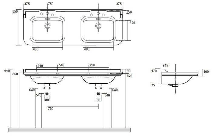 Раковина Kerasan Waldorf 150х55 см, 3 отв., двойная, керамическая, белый/бронза