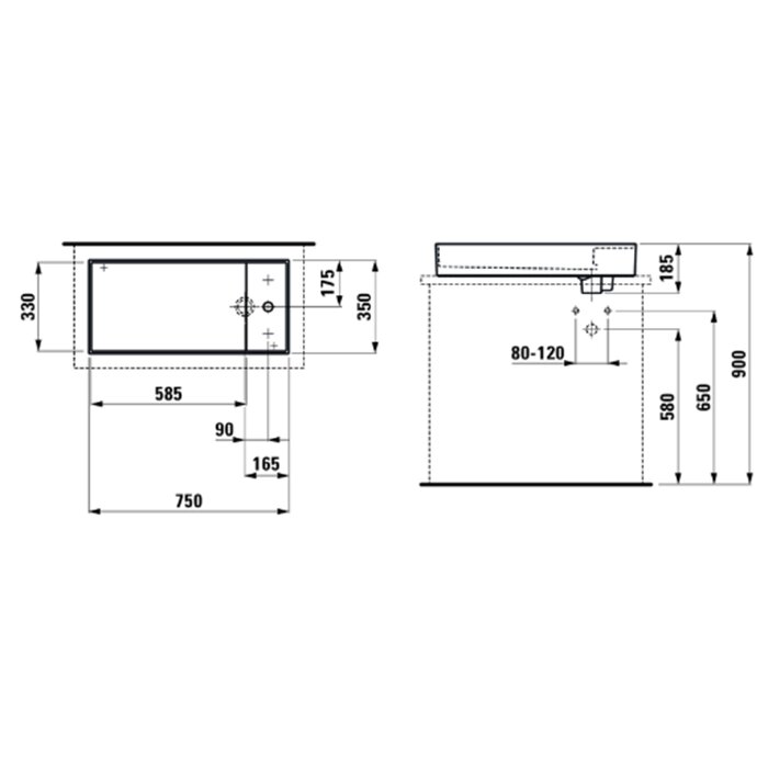 Размер: 750x350x120/185мм. Накладная раковина-чаша с полочкой, со специальным скрытым сливом.