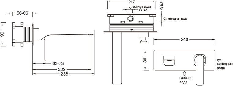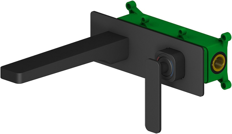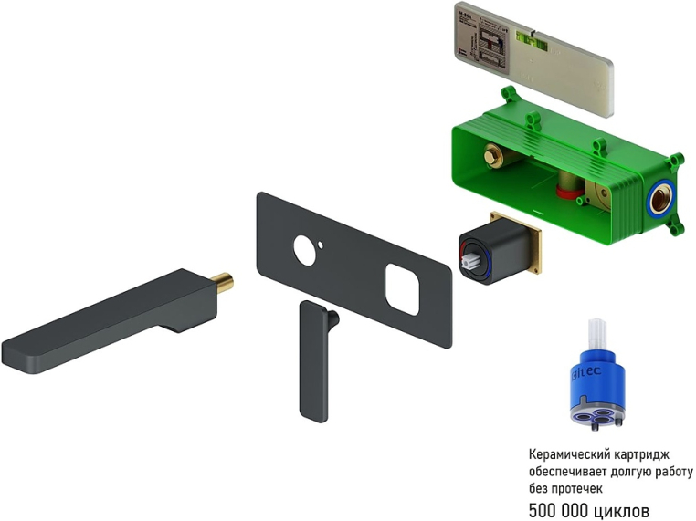В комплект поставки входят смеситель, монтажная коробка, излив, декоративная накладка, ручка смесителя и шестигранный ключ.