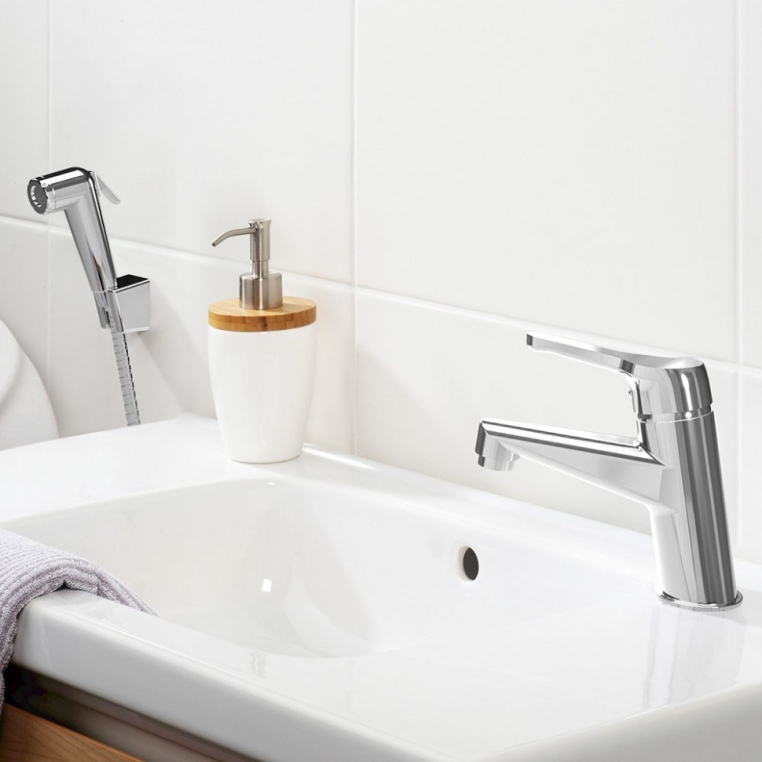 - Аэратор Neoperl под наклоном (струя отводится дальше от края раковины) наполняет воду кислородом, снижает напор воды, вследствие чего становится возможной существенная экономия воды. Сеточка легко очищается пальцем.
