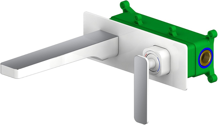 В комплект поставки входят смеситель, монтажная коробка, излив, декоративная накладка, ручка смесителя и шестигранный ключ.