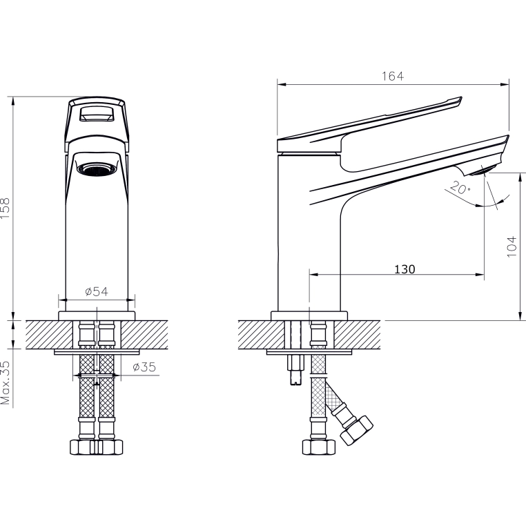 В смеситель установлен картридж D-35 с керамическими пластинами. Высота смесителя 158 мм. Излив литой, неповоротный, 123 мм. Высота излива до аэратора 104 мм. Аэратор изготовлен из пластика с нержавеющим корпусом, угол наклона аэратора- 12 гр.