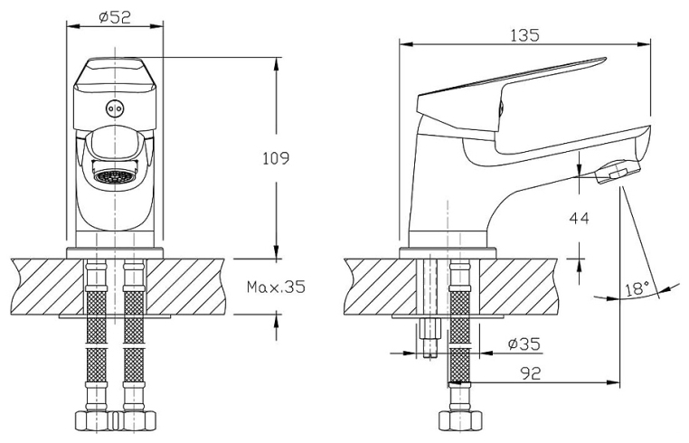В смеситель установлен картридж D-35 (RSH102) с керамическими пластинами. Высота смесителя 120 мм. Излив литой, неповоротный, 95 мм. Высота излива до аэратора 44 мм. Аэратор изготовлен из пластика с нержавеющим корпусом, угол наклона - 18 гр.