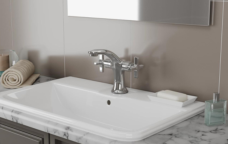 Смеситель для раковины RUSH арт. MV1135-11 с металлической ручкой из коллекции Melville изготовлен из высококачественной латуни и имеет вентильное управление.