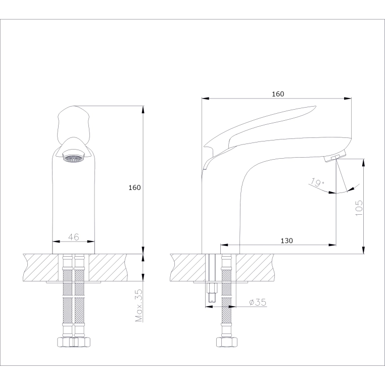 В смеситель установлен картридж D-35 с керамическими пластинами. Высота смесителя 164 мм. Излив литой, неповоротный, 128 мм. Высота излива до аэратора 105 мм. Аэратор изготовлен из пластика с нержавеющим корпусом, угол наклона аэратора- 19 гр.