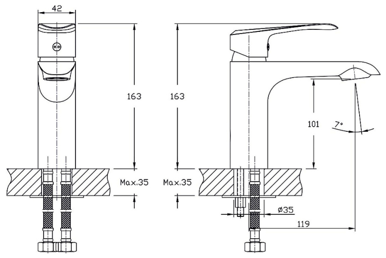 В смеситель установлен картридж D-35 с керамическими пластинами. Высота смесителя 163 мм. Излив литой неповоротный 119мм., высота излива до аэратора 101 мм. Аэратор изготовлен из пластика с нержавеющим корпусом, угол наклона аэратора- 7 гр.