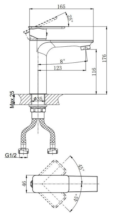 В смеситель установлен картридж D-35 с керамическими пластинами. Высота смесителя 176 мм. Излив литой, неповоротный 116 мм. Высота излива до аэратора 223 мм. Аэратор изготовлен из пластика с нержавеющим корпусом, угол наклона - 8 гр.