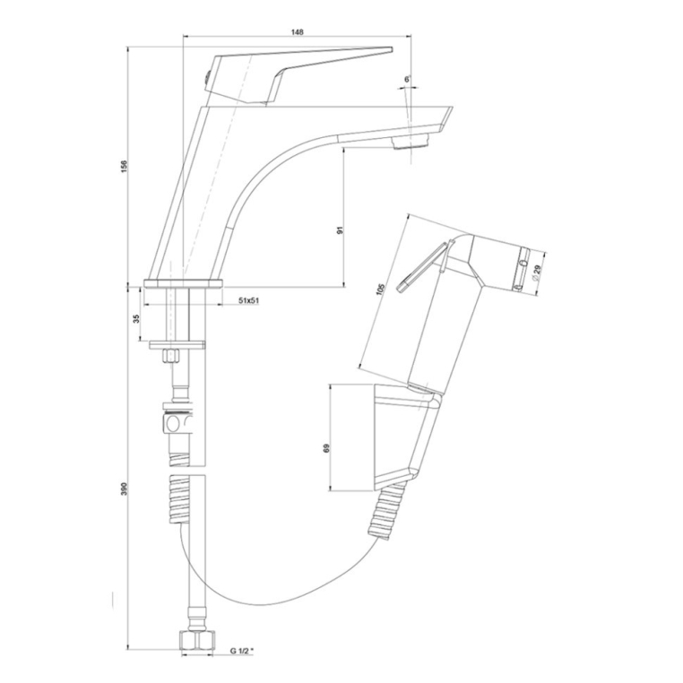 Это единое решение, позволяющее установить и смеситель, и гигиенический душ без сложного монтажа. Крепление смесителя выполняется напрямую к раковине, для лейки предусмотрен подвесной фиксатор.