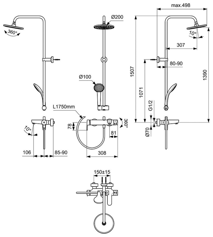 Душевая система Ideal Standard IDEALRAIN в комплекте с настенным смесителем для ванны/душа CERAFINE O