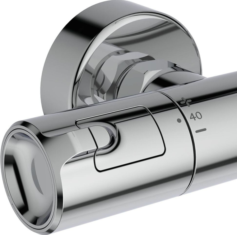 - Возможность ограничения макс. температуры воды кнопкой на 40 C и ограничения потока воды на 50% с помощью кнопок термостата