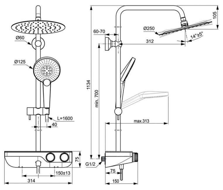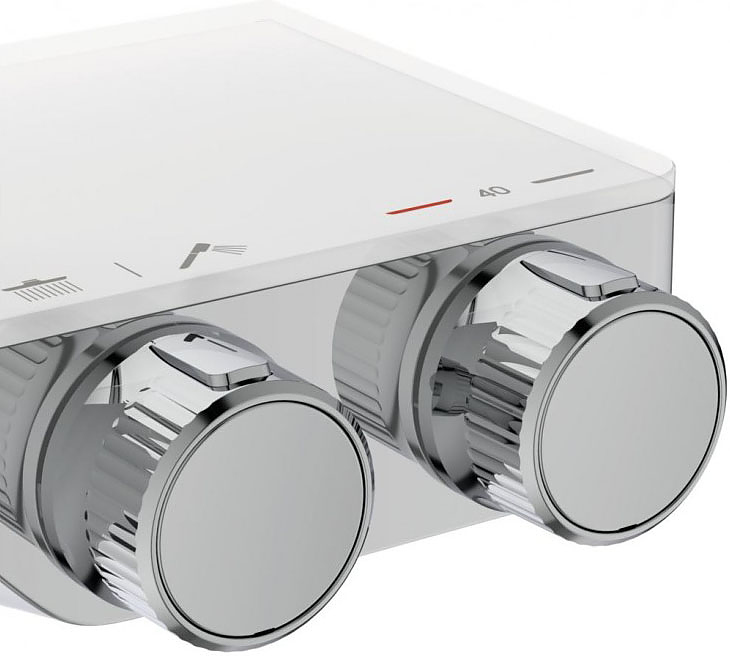 - Термостатический картридж Ideal Standard, новая технология, затворы на керамических дисках 90˚, технология "Cool body" ("Холодный корпус"), пластиковые рукоятки с ограничителями температуры (40ºC) и потока воды (50%), встроенный обратный клапан)