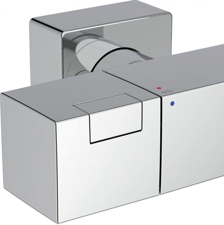 - Термостатический картридж IS, новая технология, затворы на керамических дисках G1/2 180˚, технология "Cool body" ("Холодный корпус"), пластиковые рукоятки с ограничителями температуры (40ºC) и потока воды (50%), встроенный обратный клапан)