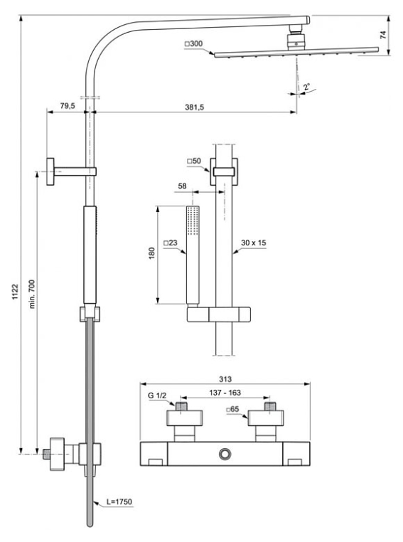 - Верхний душ: 30 х 30 см, металлический, квадратный, ограничение потока 12 л/мин