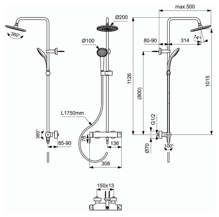 1-функциональная душевая лейка 100 мм (ограничение потока 8 л/мин.)