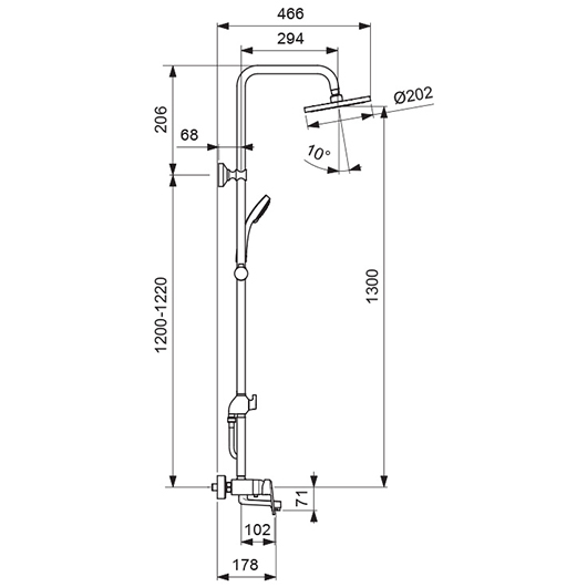 - Расстояние от нижнего крепления до верхнего душа: 1300 мм