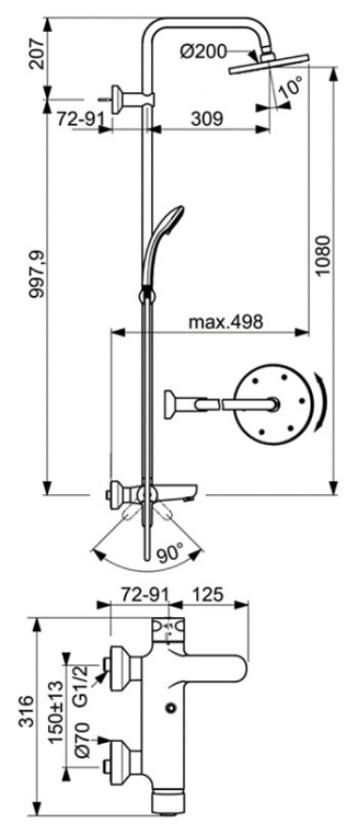 - Диаметр верхнего душа 200 мм