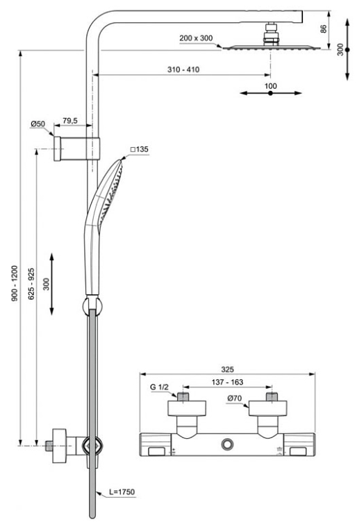 Форма верхнего душа: прямоугольная.