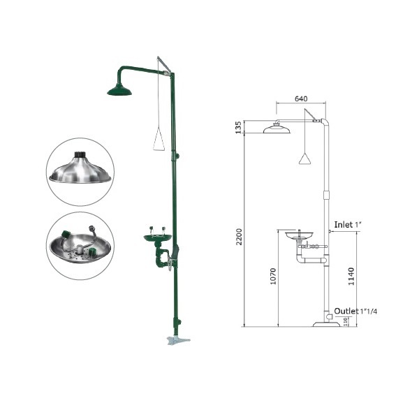 Аварийный душ предназначен для заводов, фабрик, лабораторий, где есть риск нанесения здоровья рабочему персоналу от огня, кислот, и прочих химических или радиоактивных реагентов. Раковина приводится в действие с помощью бокового рычага, душ с помощью ручки.