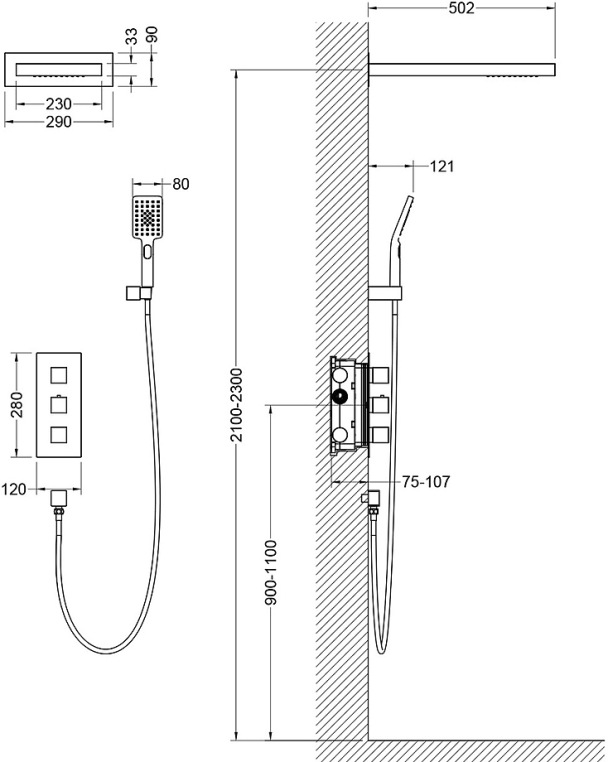 душевая лейка, настенный держатель, смеситель, шланг для душа, шланговое подключение, верхний душ