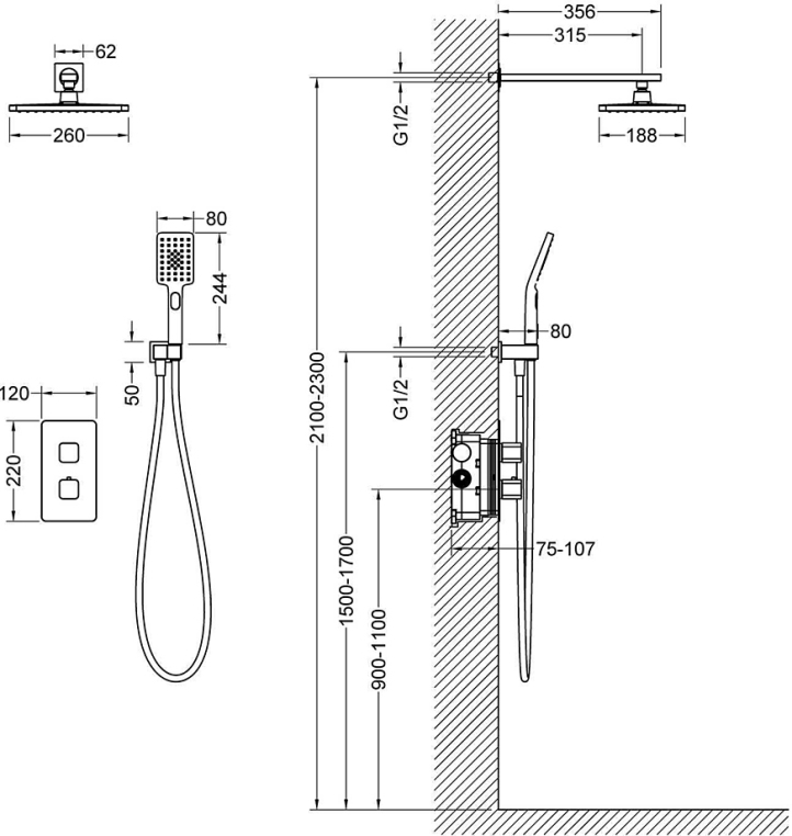: душевая лейка, настенный держатель, смеситель, шланг для душа, шланговое подключение, верхний душ, кронштейн для верхнего душа