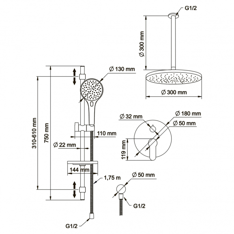 - верхний душ (душевая головка) с регулировкой наклона, потолочный монтаж;