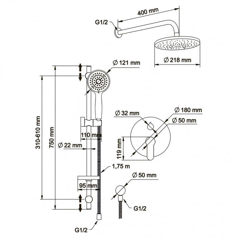 - верхний душ (душевая головка) с регулировкой наклона, настенный монтаж;