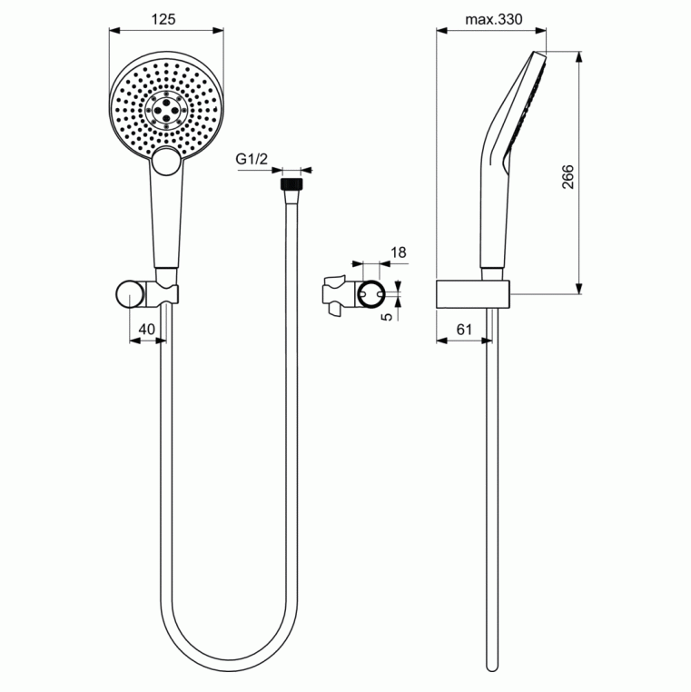 IDEALRAIN Душевой комплект с настенным держателем EVO JET ROUND XL3, диаметр лейки Ø125 мм, количество функций: 3, режим струи: Rain (Дождь), Smart Rain (Бодрящий дождь), Massage (Массаж), самоочищающаяся лейка, ограничение потока 8 л/мин, шланг 1750 мм с силикононовым покрытием IDEALFLEX®, пластиковый держатель лейки, регулировка наклона лейки