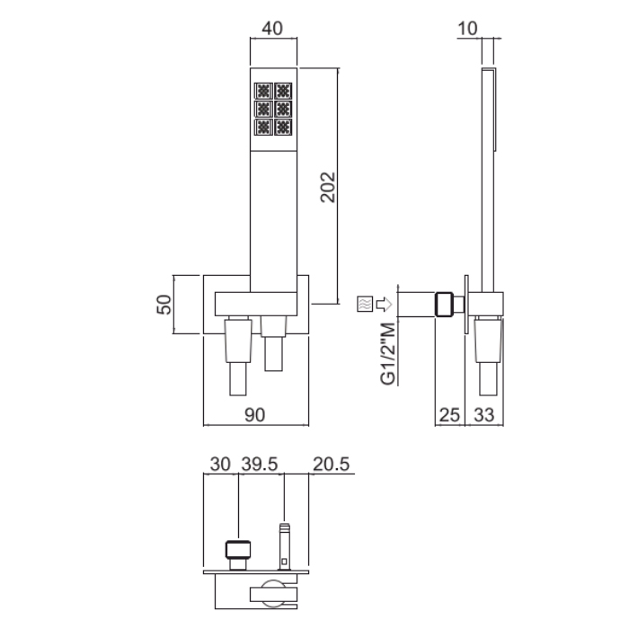 Дуплекс, состоящий из: латунного одноструйного душа, незагрязненного, проверяемого и обслуживаемого; Неподвижный встроенный прямоугольный держатель из латуни 1/2 "MM; двойной гибкий шланг, предотвращающий скручивание, из гладкого ПВХ, 150 см. ХРОМ