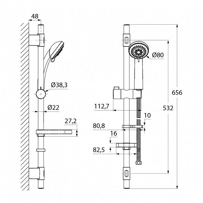 Верхний душ: нет; Количество режимов лейки: 3; Комплектация: крепления, верхнее крепление регулируется по высоте; Шланг: нержавеющая сталь; 1,5 м; cистемы Twist-Free и Double Lock; Дополнительно: мыльница; кольцо для фиксации шланга