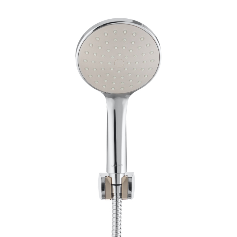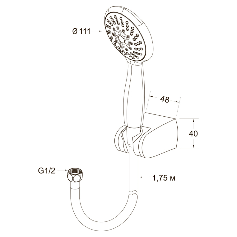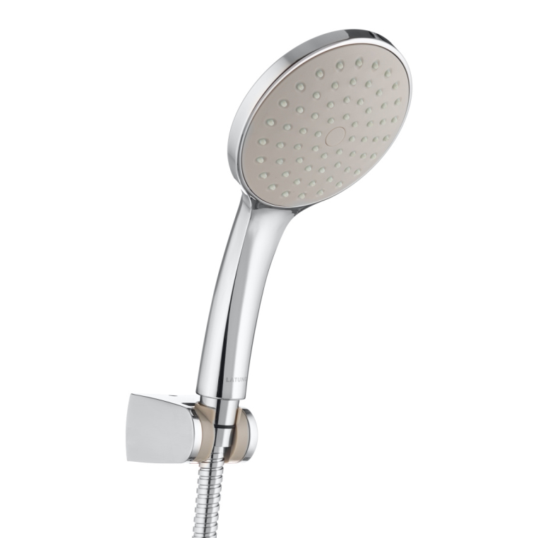 Душевой набор: лейка однорежимная 111 мм с самоочищающимися форсунками, шланг металлический 1,75 м, держатель из хромированного ABS-пластика.