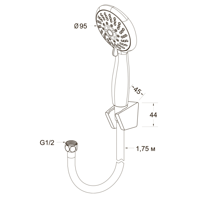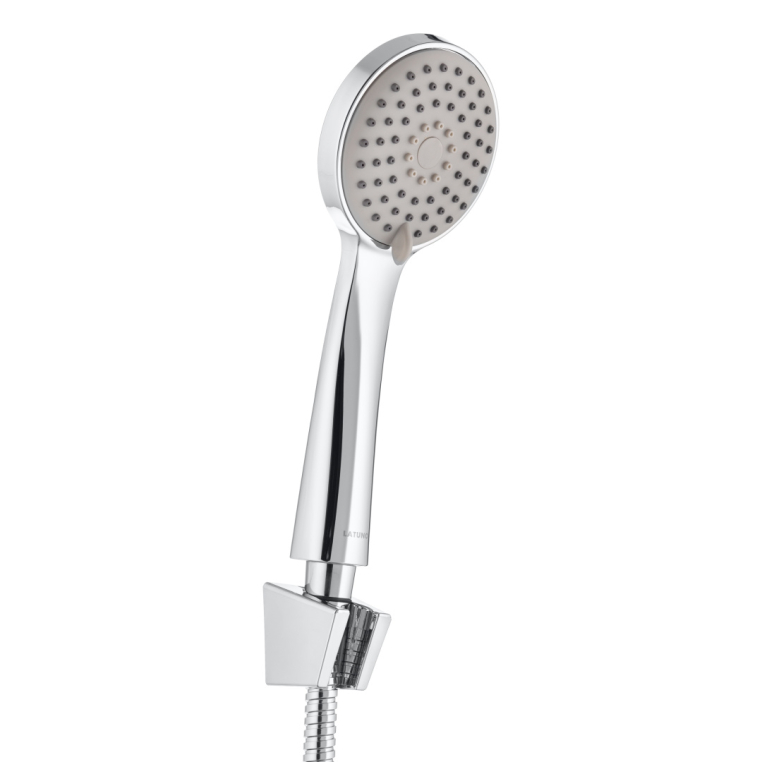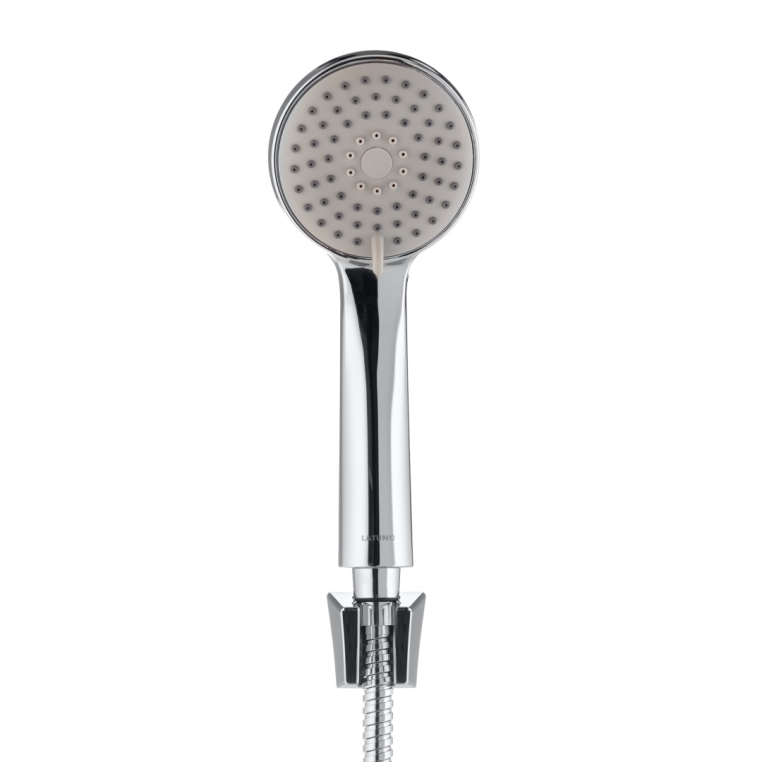 Душевой набор: лейка трехрежимная 95 мм с самоочищающимися форсунками, шланг металлический 1,75 м, держатель из хромированного ABS-пластика.