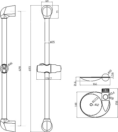 LM8065C Стойка для душа с мыльницей. Высота – 693 мм. Регулируемое по высоте крепление для лейки. Регулируемая по высоте мыльница. Регулируемый по высоте двойной крючок