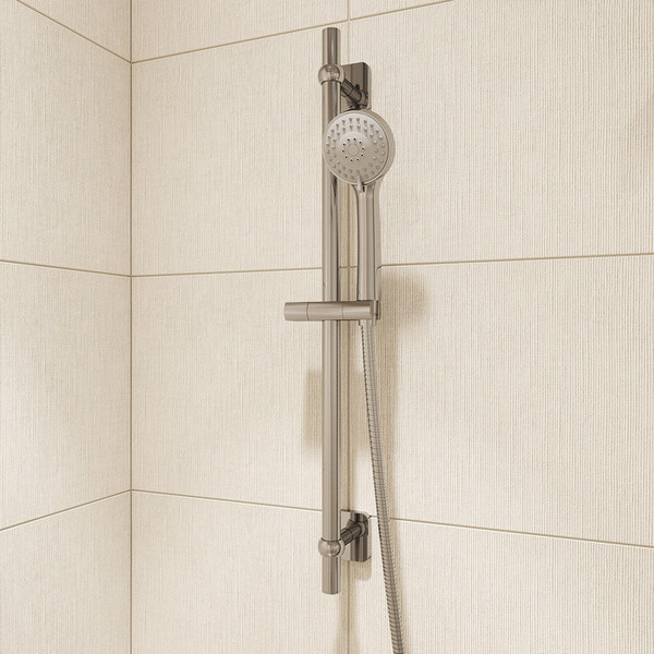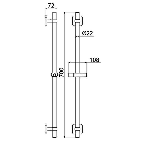 Стойка для душа, хром, нержавеющая сталь с никель-хромовым покрытием, высота 700 мм, диаметр 22 мм. Оба крепления свободные. Держатель лейки из ABS-пластика, поворотное крепление, регулировка наклона лейки. Крепеж в комплекте.